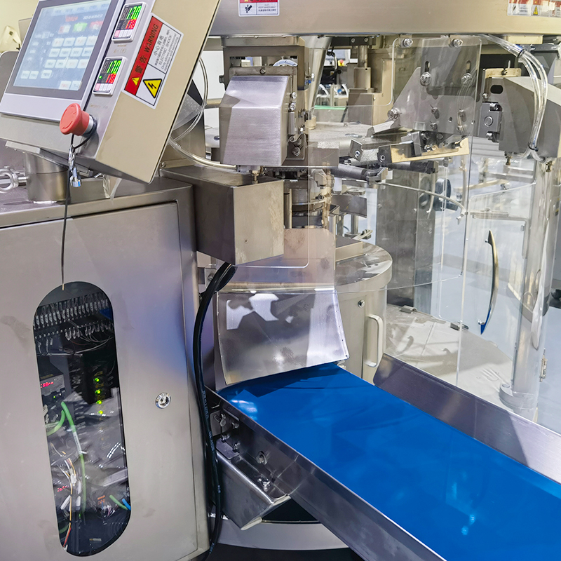 八工位粉剂包装机的工作方式极为智能灵活,工作人员在经过参数设定后,设备能够在自动模式下,无缝衔接的配合上下游自动化设备执行包装任务,给袋式包装设备的工作方式是操作人员设定好所有工作参数后,由给袋装置自动抓取输送至开袋处,经过开袋智能检测系统,自动将包装袋呈现出打开的状态,八工位粉剂包装机若是检测到无袋或者不开袋等情况状态下,下料动作会自动停止。在一切正常的状态下,物料会按照工作人员设定的包装重量进行充填,并保证每袋商品充填量的一致性输出。充填完成后,袋子被输送至封口工位进行封口处理,随后经过喷码、整形等工序。