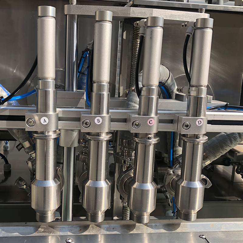 全自动四头酱料灌装机的工作原理是机遇一个较为精准的机制,通过气缸的动力来实现高粘度酱料的抽取和灌装。活塞式灌装机械在启动后,气缸便进入了工作模式,此时将带动与相连的活塞作往复直线运动,在活塞向后推动的过程中,灌装头则形成了负压,此时全自动四头酱料灌装机的灌装头相连的单向阀开启,物料在大气压的作用下,从储料罐内吸入至活塞腔室内,完成吸料过程,在活塞向前运动时,腔室内的酱料受到挤压,压力增大,使得通向灌装头的单向阀打开,物料便被精准地注入到四个灌装容器当中。活塞式灌装机械在整个生产过程中属于自动化完成全部的工作内容,不需要人工过多干预。