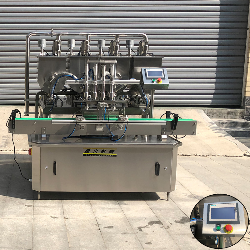 全自动四头酱料灌装机可用于各种高粘稠度酱体物料的自动化生产设备,对于市面上的:花生酱、甜面酱、蟹黄酱、辣椒酱、芝麻酱、黄豆酱、藤椒酱、剁椒酱、香椿酱、果酱等物料执行自主灌装生产条件。活塞式灌装机械拥有四个灌装头,四个酱料料箱,以独特的工作方式和出色的灌装性能,成为了酱料灌装产业提高生产效率、保证生产品质的主要生产设备。星火智能作为专业制造各种智能化、自动化机械设备的生产厂家,通过多年制造经验,为广大用户推出了这款高度智能的机械设备。