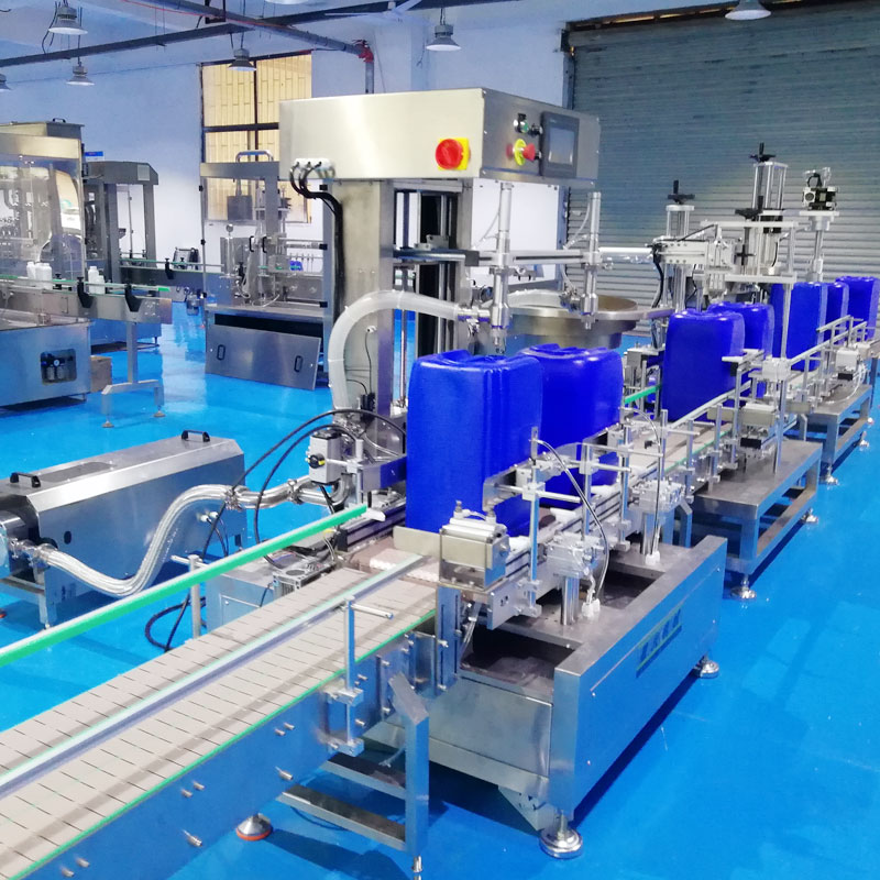 双头全自动液体称重灌装机采用了联动生产线的模式,其中包括:输送带、称重灌装机、上盖机、压盖机、旋盖机等自动化设备,它的工作方式较为智能,采用先进的活塞定量原理配合称重控制技术,能够完成无人辅助灌装模式。全自动称重灌装机在进入工作模式后,空的大桶容器通过输送带将容器输送至灌装工位,光电传感器可以精准确定容器的位置,保证灌装头精准的对准容器口此时的剂量泵,经过上下运动将液体注入在容器内,在灌装过程中称重感应系统可以实时检测重量,当达到预设值时系统自动停止灌装运动。双头定量灌装旋盖生产线在灌装完成后,机器将自动进入上盖、旋盖的工作模式,确保旋盖紧密无松动,直至出品输出。