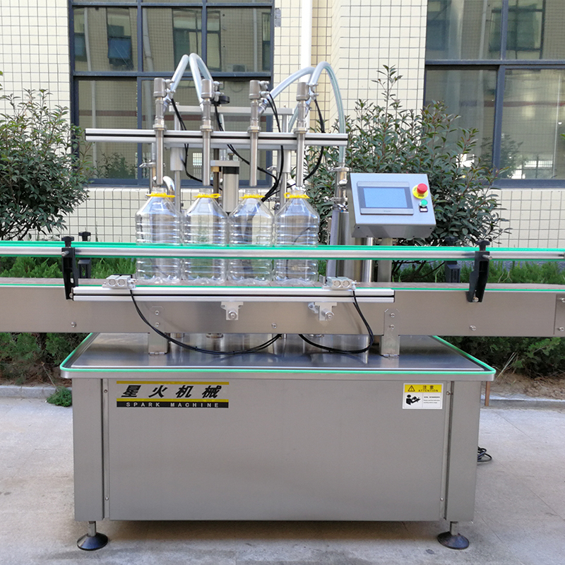 智能液体灌装机主要由储藏料斗、输送管道、灌装头、液位控制器、输送带、防滴漏装置等设备组成。食用油自动化灌装机的整个工作过程全部处于智能操作条件下完成,它主要由PLC控制器配合彩色人机电脑显示屏,正式工作前,工作人员应当提前将液体备至在储料斗内,料斗中的液位高度控制着设备的灌装速度和液体水平,所以在进入灌装工作前,需要提前将灌装规格设置在显示屏幕当中,启动机器后,液体将通过输送管道被传输至灌装头,灌装头将会按照预设的灌装量将液体精准的充填至容器当中,灌装与预设规格一致的容量后,智能液体灌装机会带动产品进入下一个生产工序。