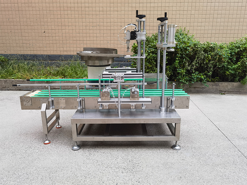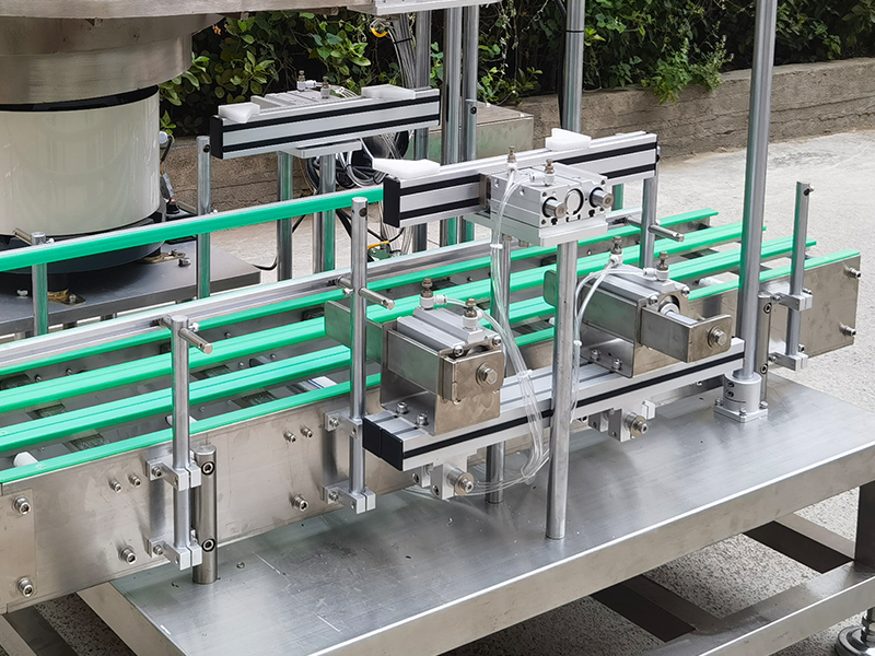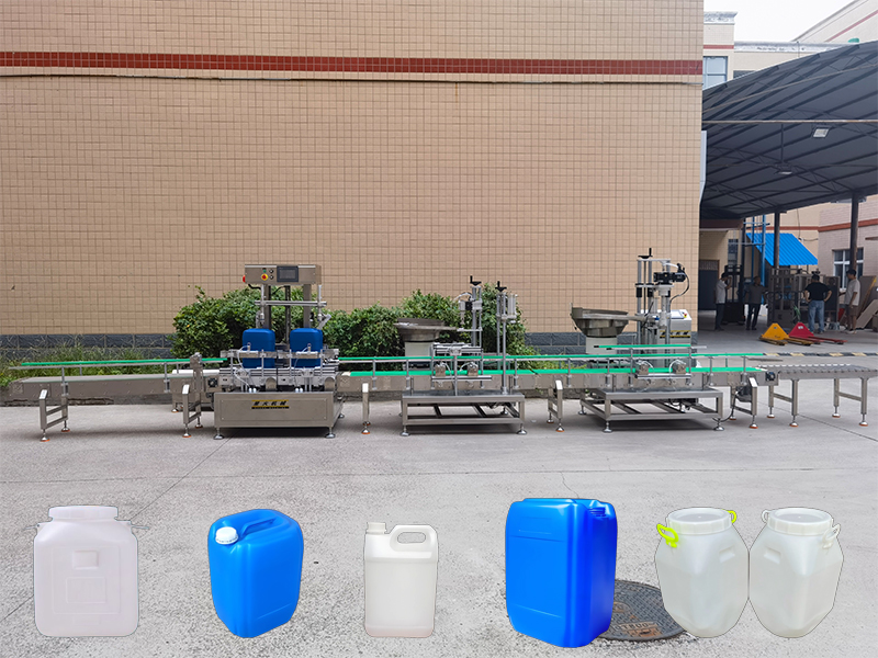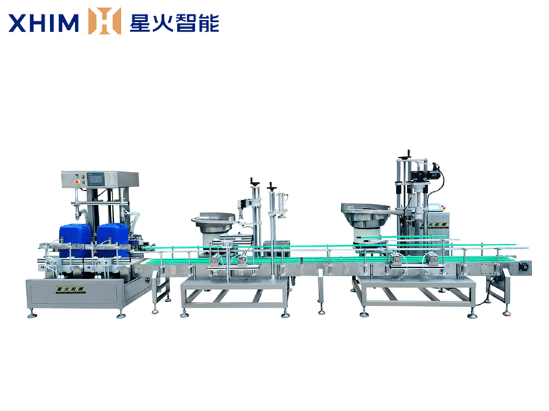 50公斤称重灌装生产线基于动态称重反馈系统实现精准定量,快速输出等多个环节的灌装,首先是进料阶段,物料通过管道进入灌装头部分,自动化定量灌装机在重力和压力驱动下流入所需灌装的大桶物料内,此时的高精度重力感应器会根据充填进容器内的重量实时反馈,并将数据快速输送至PLC控制系统的显示屏幕内,让用户更加清晰查看生产过程,以及充填进容器内的重量变化,若重量未达到生产标准,系统会控制灌装头以较大流量快速充填,在重量接近设定数值时,灌装头切换至小流量补料模式,确保灌装精度控制在极小的范围内,然后50公斤称重灌装生产线在感应到重量达到目标后,PLC系统立即发出指令,关闭灌装阀门,停止物料输送,并出发容器送至上盖、压盖、旋盖工位。